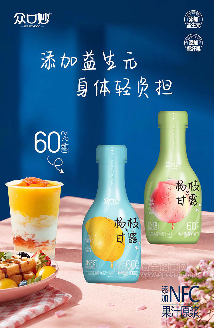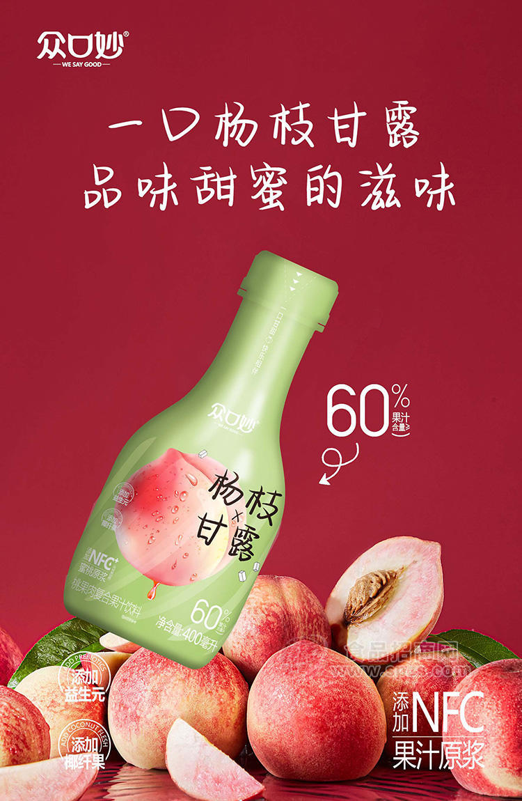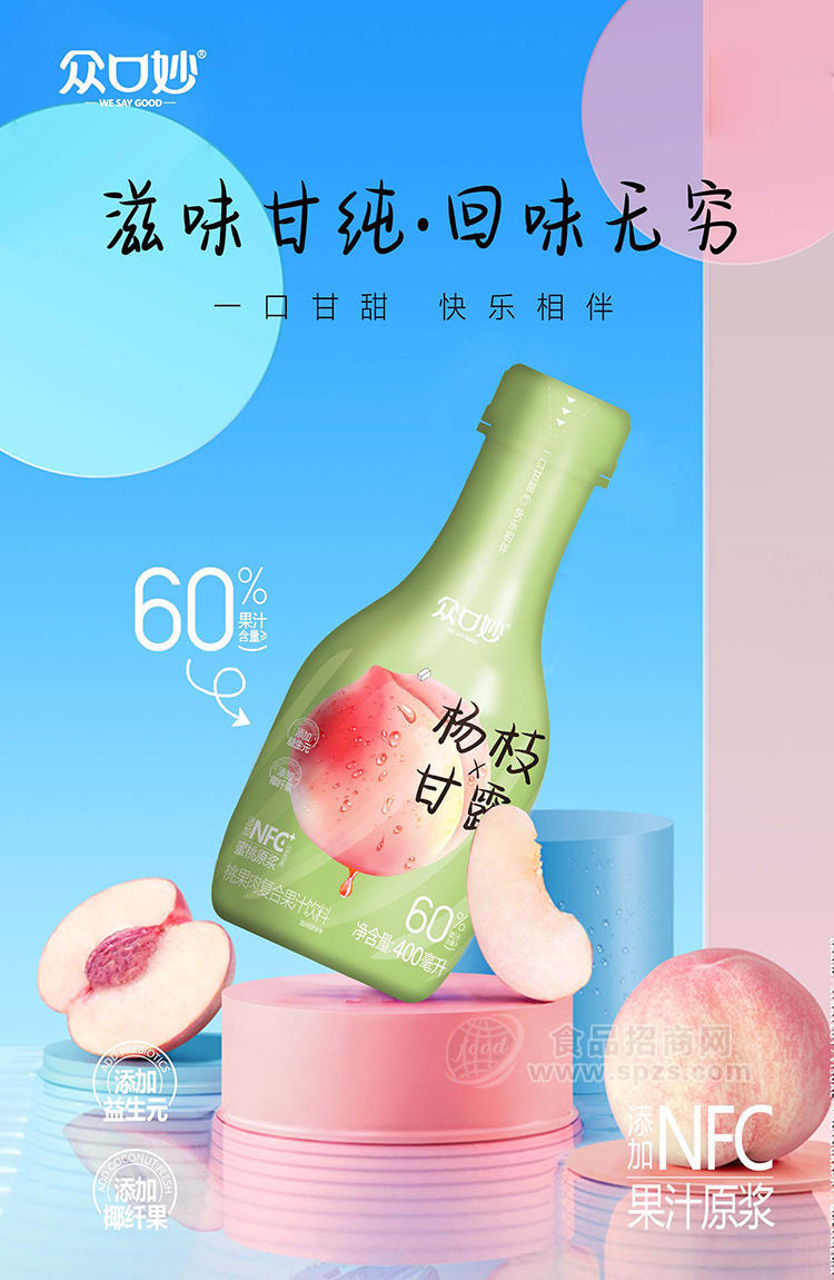 1、众口妙杨枝甘露桃果肉复合果汁饮料瓶装招商400ml经销商必须有经营销售能力。