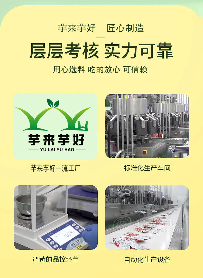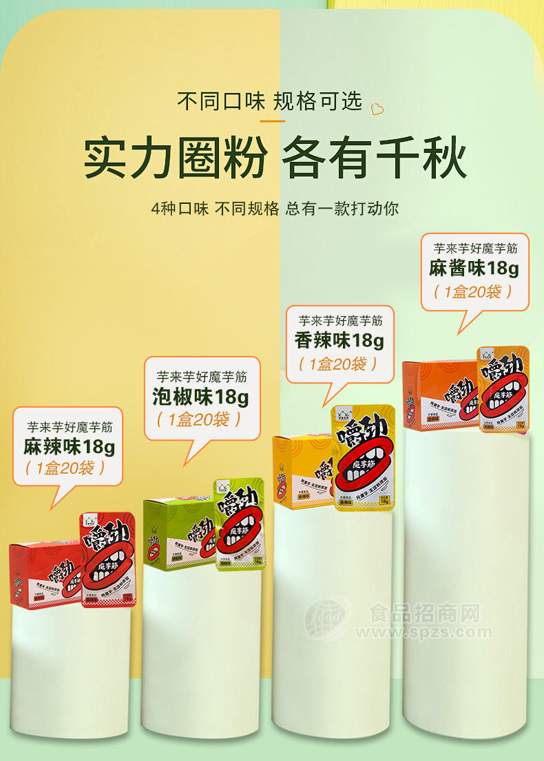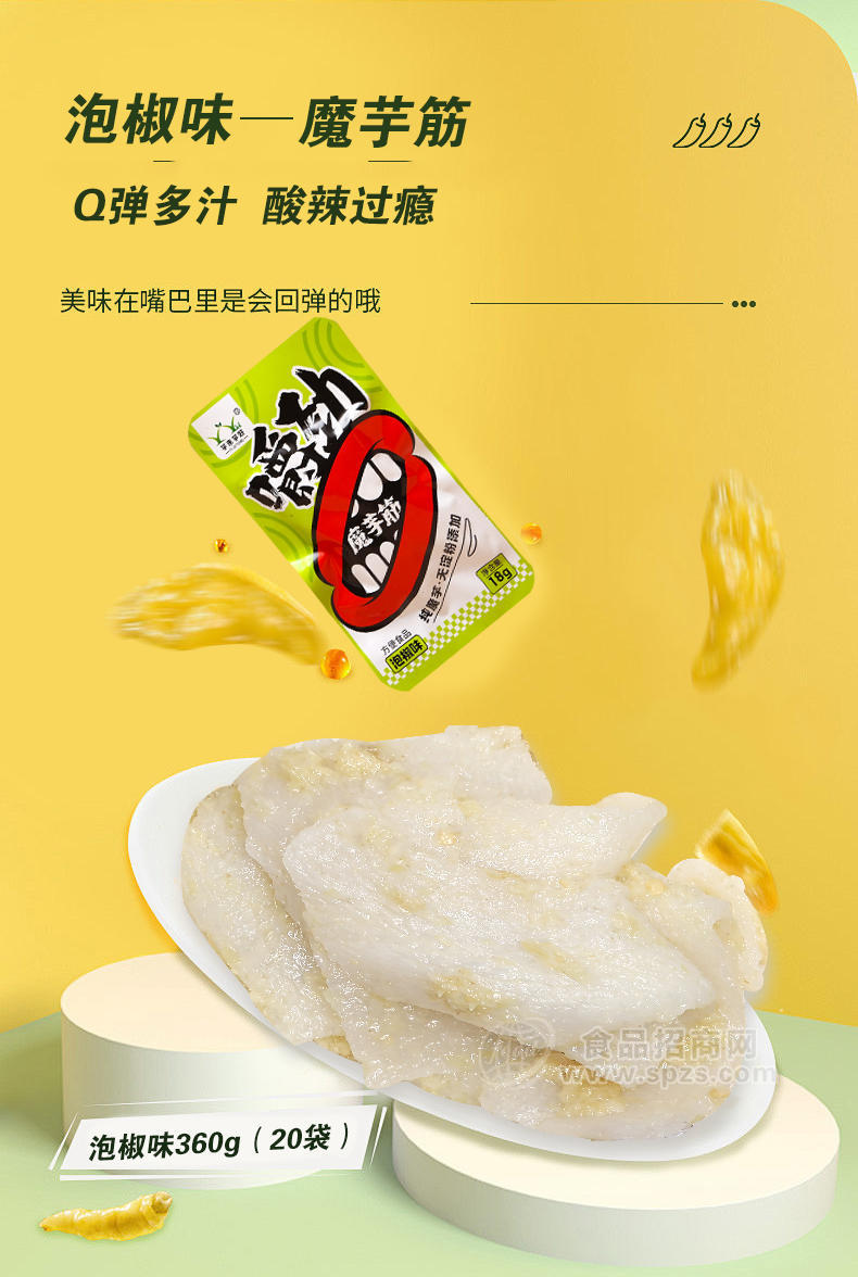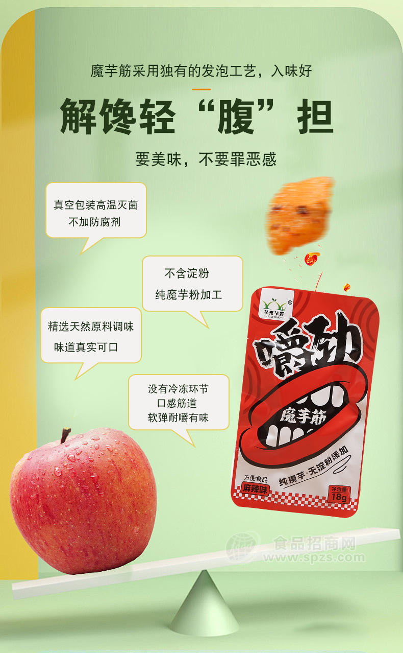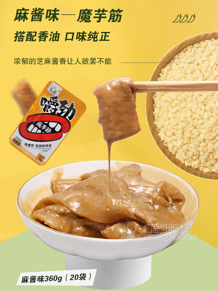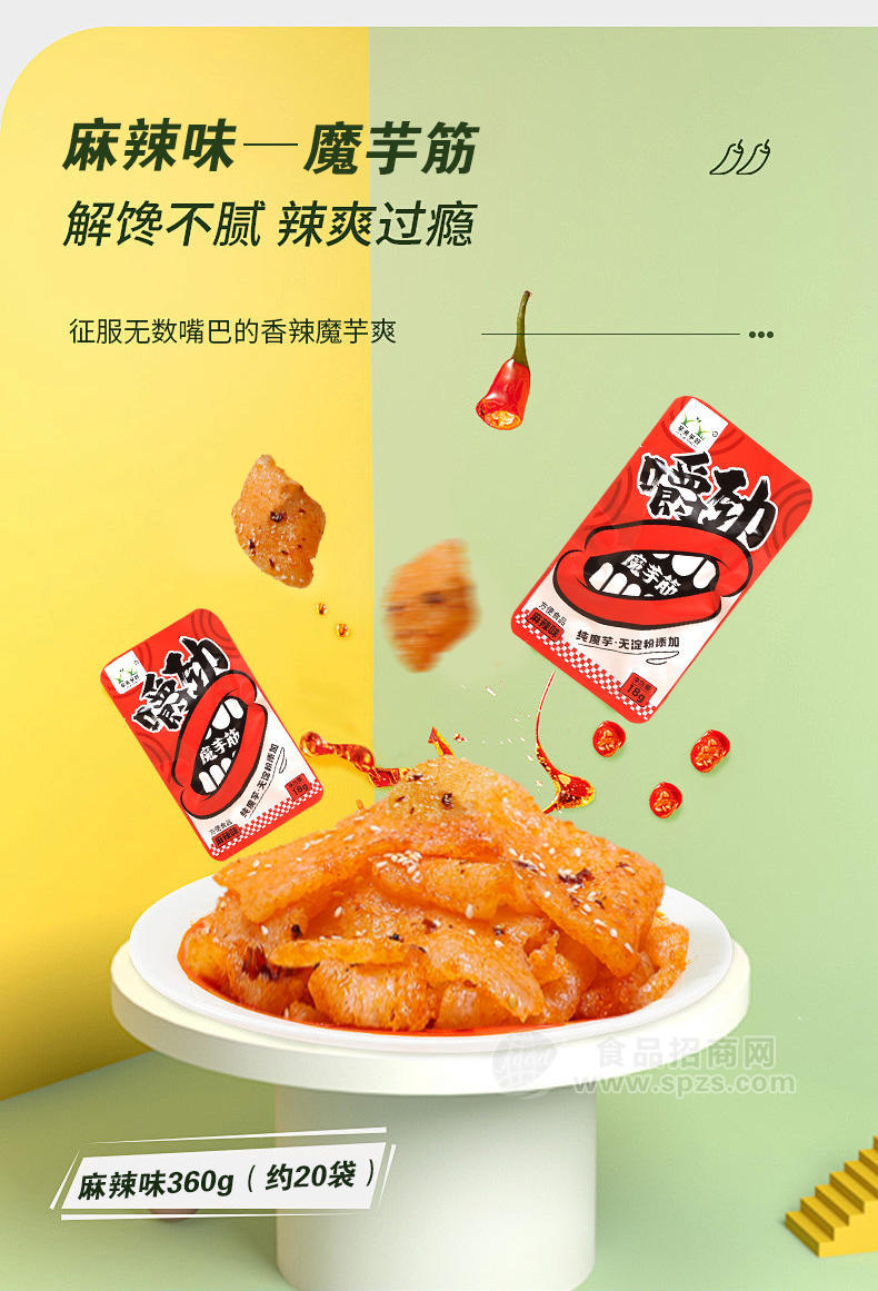 魔芋筋采用独有的发泡工艺,彻底去除魔芋怪味产品呈蜂窝状,更好入味。生产中不添加淀粉,纯魔芋粉加工。魔芋筋没有冷冻环节,口感筋道,不发硬,越嚼越有味。并且真空高温灭菌,不加防腐剂。自己熬油,天然调味,味道真实可口。有香辣,麻辣,麻酱,泡椒四种口味。