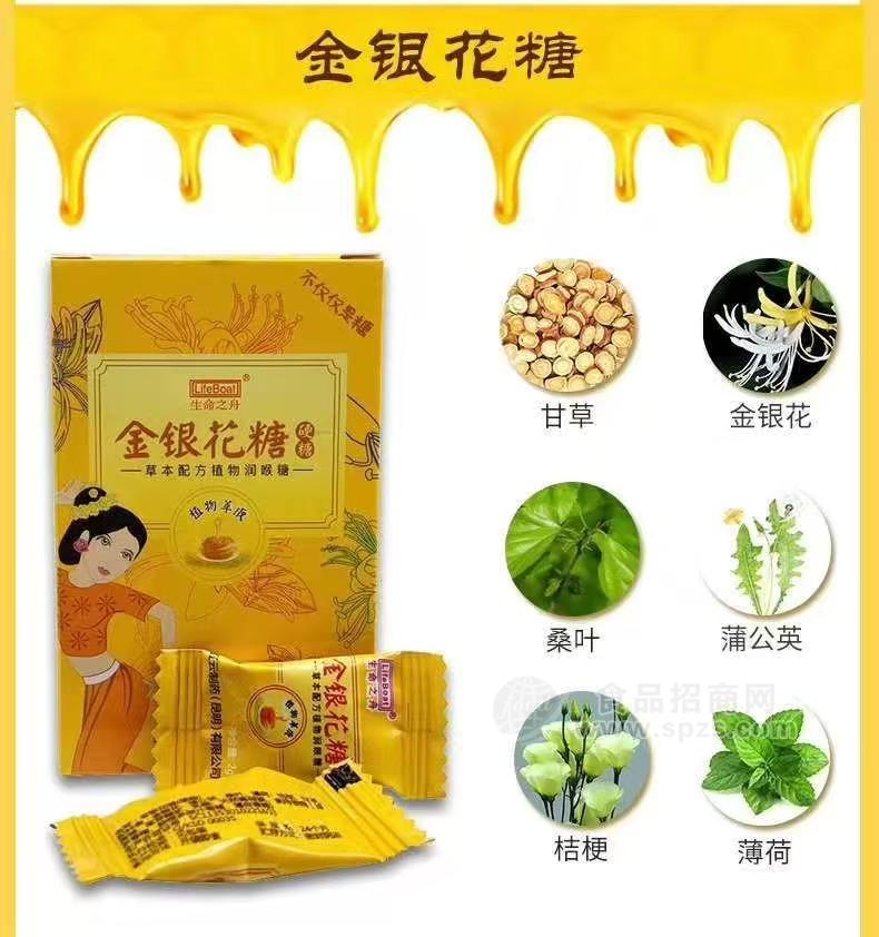金银花糖:所含食药两用的药材有:金银花、蒲公英、桑叶、薄荷、桔梗、甘草,主要针对咽喉肿痛、消炎祛火
