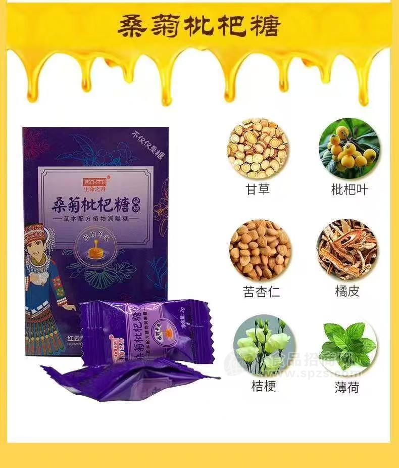 桑菊枇杷糖:所含食药两用的药材有:桑叶、菊花、枇杷果、橘皮、薄荷、桔梗,主要针对清热润燥、润肺利咽