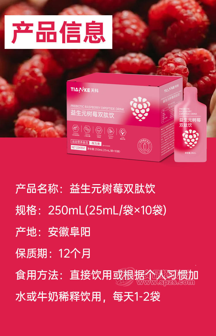 代工贴牌益生元树莓双肽饮 特殊膳食运动营养是由安徽天科生命医学科技有限公司发布的功能饮料产品,了解代工贴牌益生元树莓双肽饮 特殊膳食运动营养或者有代理或者批发采购代工贴牌益生元树莓双肽饮 特殊膳食运动营养均可与厂家联系,沟通洽谈。