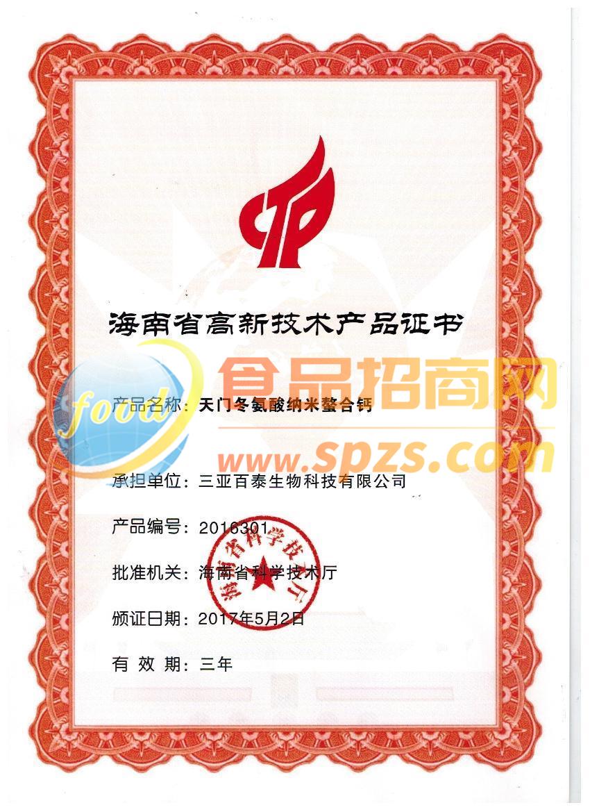 2011年9月,参与起草国家标准GB29226-2012,填补了国内天门冬氨酸钙生产标准的空白;先后被认定为高新技术项目、高新技术企业、高新技术产品;先后荣获海南科技产业十大影响力领军企业、海南国际旅游岛生物制药行业领军企业、海南省技术创新先进单位、海南省诚信示范企业、海南省自主创新十大知名企业、食品科技创新标兵单位、中国创新创业大赛(海南赛区)成长企业组二等奖、三亚市优*企业、助残先进单位、三亚市*具责任心企业、3.15中国名优食品推广品牌、建国70周年·海南科技产业发展功勋企业、建国70周年·海南自贸区(港)十佳科技创新型企业、2018-2019年度三亚市打赢脱贫攻坚战先进集体、全国工商联2019年民营企业调查点工作示范单位、三亚市就业创业扶贫基地等荣誉称号。是中国中药协会慢病防*药物研究专业委员会创会单位、中国健康促进与教育协会微生态健康分会副会长、海南省高新技术产业联合会副会长单位、三亚市工商业联合会(总商会)副会长单位。 公司现有员工68人,大学本科占80%以上,其中科研人员占50%以上。