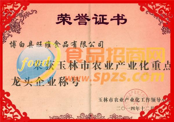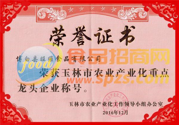 公司成立之初就十分注重企业自身的建设和管理,狠抓产品质量、卫生及安全管理工作,坚持诚实守信经营理念,因而使公司不断发展壮大,先后获得博白县相关部门授予“诚信单位”、“税收重点企业”、“重点保护企业”及玉林市农业产业化“重点龙头企业”等称号;公司通过了广西出入境检验检疫局出口食品生产企业备案审查,并获得了出口食品生产企业备案证明,还通过了中国质量认证中心(CQC)、犹太(Kosher) 、清真(Halal)等认证机构认证,获得了HACCP认证证书、犹太认证证书、清真认证证书等。